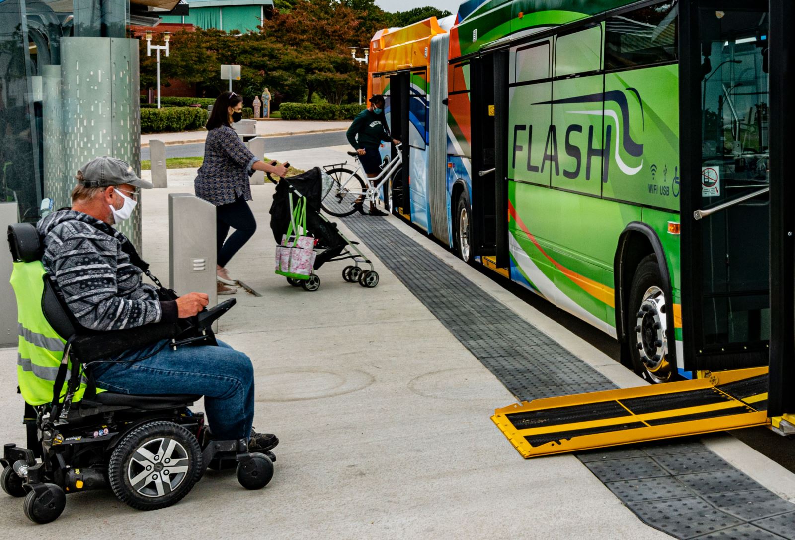 Here's What Riders Are Saying...Feedback from Flash Riders.  Eighty-passenger, 62-foot Flash buses have spacious interiors with bike racks inside the bus.   Flash project team members launch the Flash Service on October 14, 2020. |